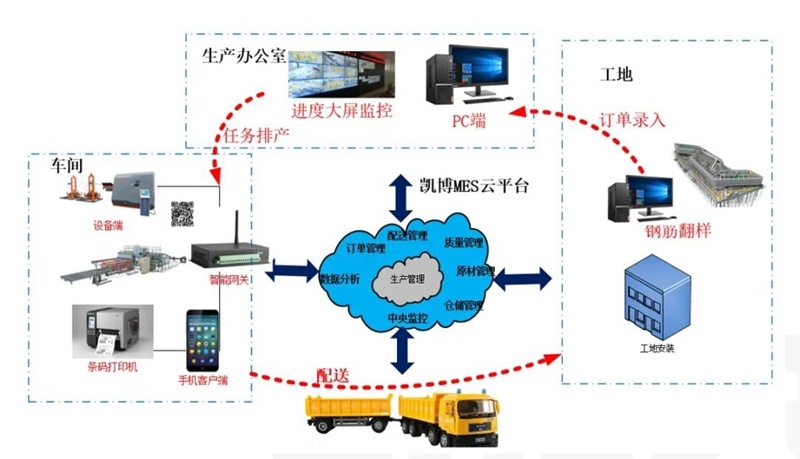 并且,凱博科技攜手中國(guó)鐵道科學(xué)研究院集團(tuán)有限公司,開發(fā)凱博鋼筋加工管理軟件系統(tǒng)和鋼筋加工遠(yuǎn)程控制系統(tǒng),打造智能控制中心。鋼筋加工管理軟件系統(tǒng)以鋼筋加工過程中物資流管理為核心,借助工業(yè)互聯(lián)網(wǎng)、云服務(wù)、智能設(shè)備等技術(shù)手段,實(shí)現(xiàn)多項(xiàng)目多任務(wù)遠(yuǎn)程訂單管理,實(shí)現(xiàn)訂單排產(chǎn)、生產(chǎn)訂單分發(fā)、生產(chǎn)標(biāo)牌打印、成品完成報(bào)工,成品出入庫等功能,同時(shí)能夠以電子大屏實(shí)現(xiàn)項(xiàng)目訂單動(dòng)態(tài)實(shí)時(shí)監(jiān)控、加工廠整體運(yùn)營(yíng)狀態(tài)的中心化顯示。鋼筋加工遠(yuǎn)程控制系統(tǒng),可實(shí)時(shí)顯示加工場(chǎng)各種設(shè)備生產(chǎn)狀態(tài),同時(shí)實(shí)現(xiàn)中控室對(duì)現(xiàn)場(chǎng)設(shè)備啟動(dòng)和停止的遠(yuǎn)程控制,造就了高鐵梁場(chǎng)鋼筋加工數(shù)字化新模式!