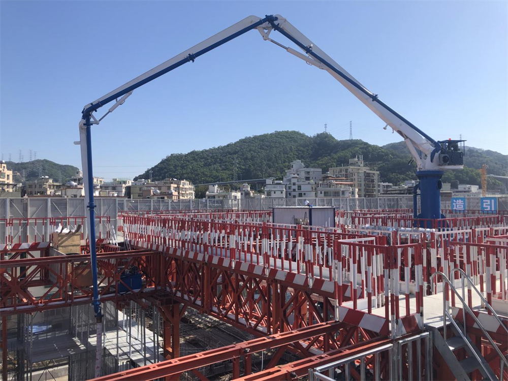 模架式液壓混凝土布料機(jī)自帶鋼平臺(tái)底座,與爬模架體連接傳遞施工載荷,無需自帶動(dòng)力系統(tǒng),爬模爬升時(shí)帶動(dòng)其爬升。其中HGY21模架式液壓混凝土布料機(jī)于2021年11月成功應(yīng)用在使用“住宅造樓機(jī)”的裝配式建筑領(lǐng)域(中建三局承建的廣州大源村項(xiàng)目)。