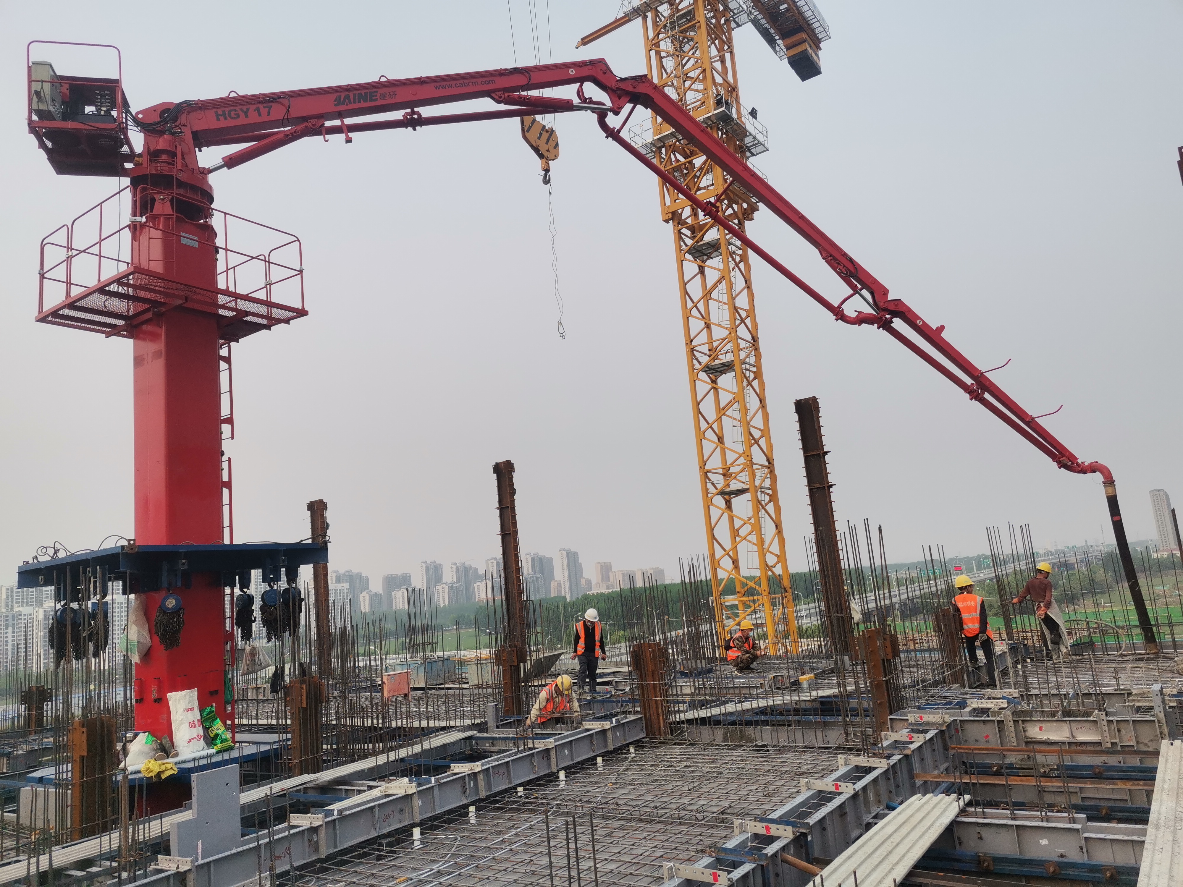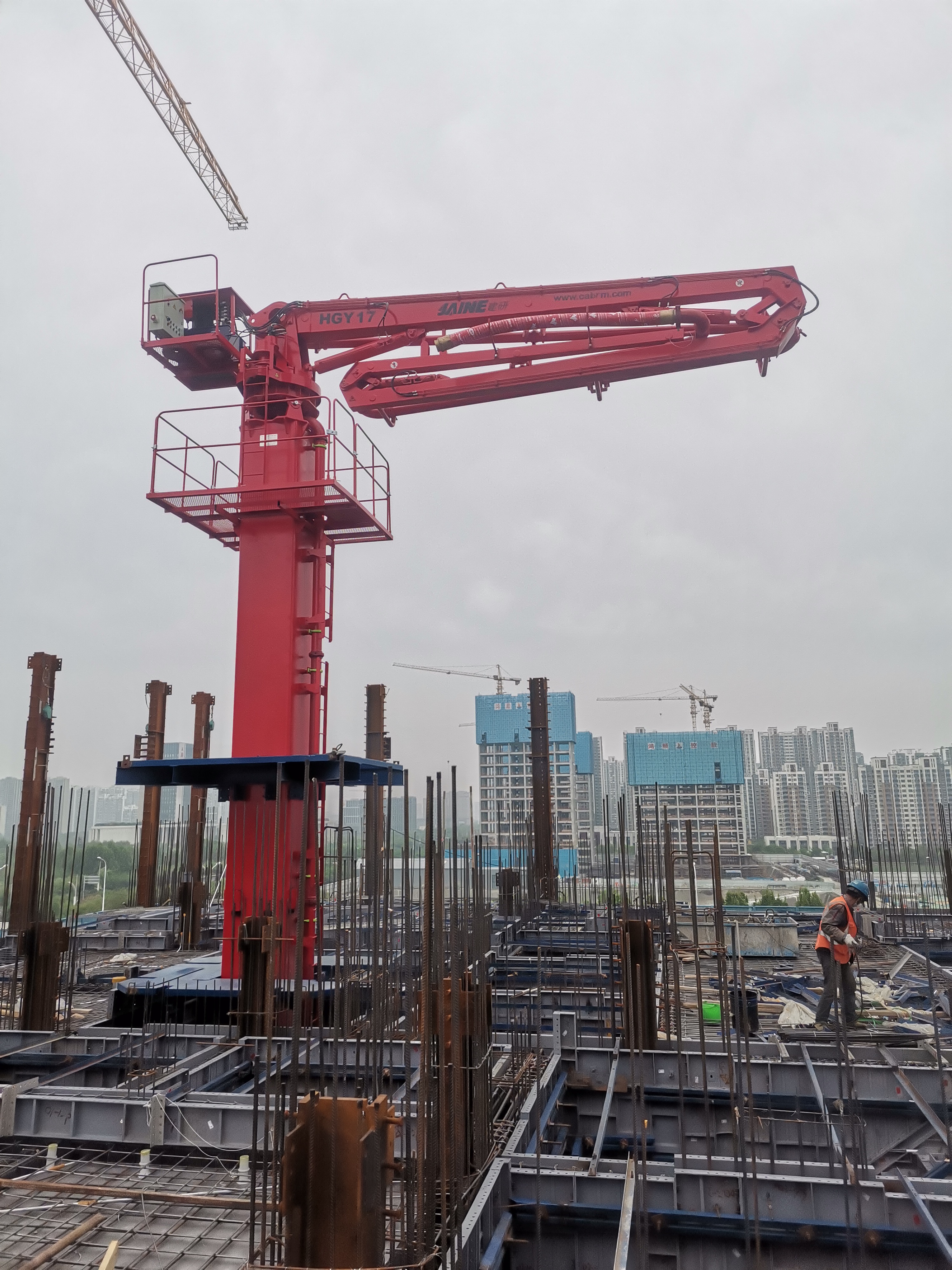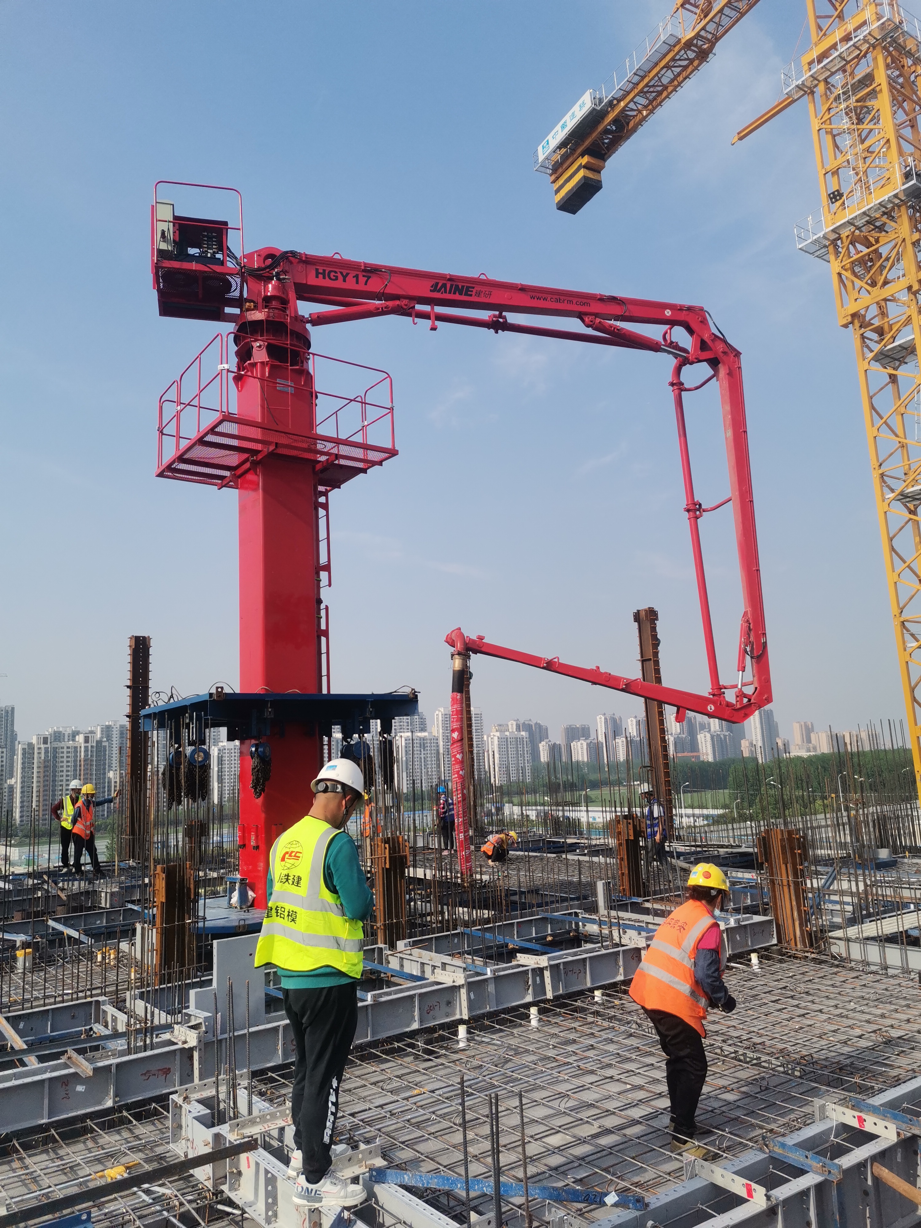 JAINE建研?內(nèi)爬式布料機(jī)適用于高層建筑施工,塔身固定在電梯井或者樓板預(yù)留孔內(nèi),可利用爬升框架和液壓油缸的頂升動(dòng)作在樓層間爬升,使布料機(jī)隨著施工層面的升高而升高。