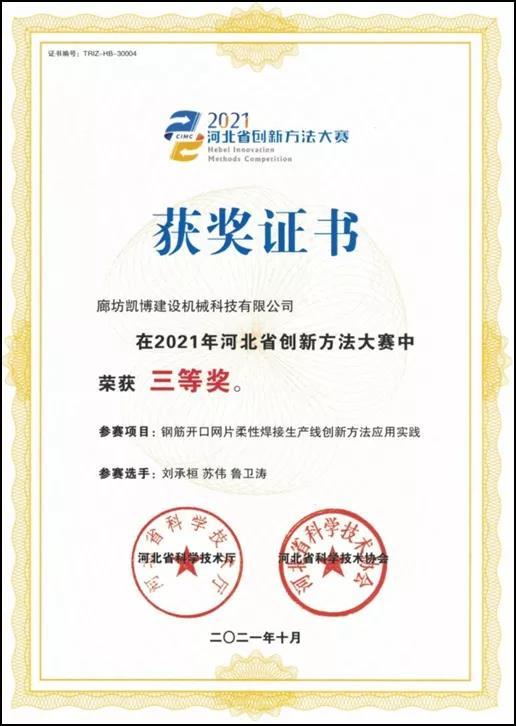 廊坊凱博建設(shè)機械科技有限公司(以下簡稱“凱博科技”)完成的“鋼筋開口網(wǎng)片柔性焊接生產(chǎn)線創(chuàng)新方法應(yīng)用實踐”項目在2021年河北省創(chuàng)新方法大賽中榮獲三等獎。此次參賽是凱博科技創(chuàng)新團隊第二次參加河北省創(chuàng)新方法大賽,2019年凱博科技“教學(xué)型塔式起重機”項目曾獲“2019河北省創(chuàng)新方法大賽三等獎”。