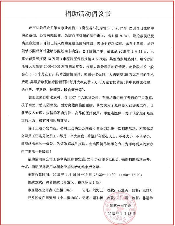 一方有難,八方支援。我公司第六事業(yè)部員工郭玉紅(崗位是車(chē)間庫(kù)管)于2017年12月3日在家中突然暈倒,經(jīng)市醫(yī)院診斷,為高血壓引起的腦干出血,經(jīng)搶救現(xiàn)已脫離生命危險(xiǎn),目前已轉(zhuǎn)入廊坊愛(ài)德堡醫(yī)院救治,仍處于昏迷狀態(tài),無(wú)自主意識(shí),是否能夠蘇醒或何時(shí)能夠蘇醒還無(wú)法判斷。郭玉紅來(lái)自衡水農(nóng)村,自2007年入職我公司,在廊坊市組建了普通的三口家庭,孩子尚處于幼兒園階段,面對(duì)突然降臨的重病,其丈夫?yàn)榱苏疹檺?ài)人已辭去工作,目前無(wú)收入來(lái)源。不論經(jīng)濟(jì)層面還是精神層面,病情的不確定性、高昂的醫(yī)療費(fèi)用,對(duì)于該家庭都是極其沉重的壓力,極有可能因病致貧。